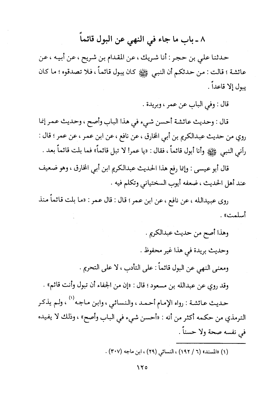 حدثنا علي بن حجر: أنا شريك، عن المقدام بن شريح، عن أبيه، عن عائشة؛ قالت: من حدثكم أن النبي - صلى الله عليه وسلم - كان يبول قائمًا، فلا تصدقوه؛ ما كان يبول إلا قاعدًا.