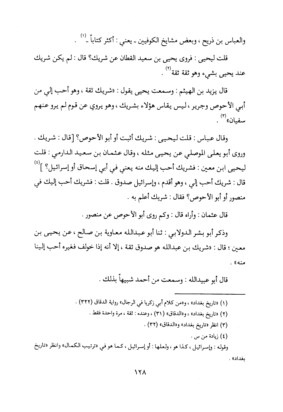 وقال عباس: قلت ليحيى: شريك أثبت أو أبو الأحوص؟ [قال: شريك. وروى أبو يعلى الموصلي عن يحيى مثله، وقال عئمان بن سعيد الدارمي: قلت ليحيى بن معين: فشريك أحب إليك منه يعني في أبي إسحاق أو إسرائيل؟] (¬4) قال: شريك أحب إلي، وهو أقدم، وإسرائيل صدوق. قلت: فشريك أحب إليك في منصور أو أبو الأحوص؟ فقال: شريك أعلم به.