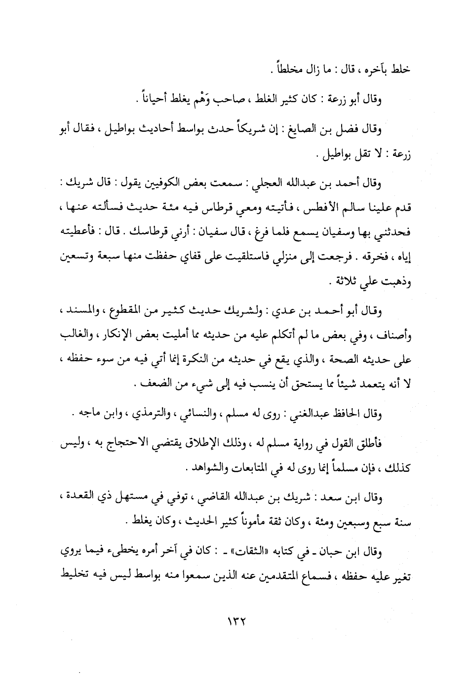 وقال أبو أحمد بن عدي: ولشريك حديث كثير من المقطوع، والمسند، وأصناف، وفي بعض ما لم أتكلم عليه من حديثه مما أمليت بعض الإنكار، والغالب على حديثه الصحة، والذي يقع في حديثه من النكرة إنما أتي فيه من سوء حفظه، لا أنه يتعمد شيئًا مما يستحق أن ينسب فيه إلى شيء من الضعف.