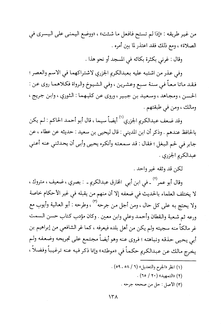 وقال أبو عمر (¬2) -في ابن أبي المخارق عبد الكريم-: بصري، ضعيف، متروك، لا يختلف العلماء بالحديث في ضعفه إلا أن منهم من يقبله في غير الأحكام خاصة ولا يحتج به على كل حال، ومن أجل من جرحه (¬3)، وطرحه: أبو العالية وأيوب مع ورعه ثم شعبة والقطان وأحمد وعلي وابن معين. وكان مؤدب كتاب حسن السمت غر مالكًا منه سجيته ولم يكن من أهل بلده فيعرفه، كما غر الشافعي من إبراهيم بن أبي يحيى حذقه ونباهته؛ فروى عنه وهو أيضًا مجتمع على تجريحه وضعفه ولم يخرج مالك عن عبد الكريم حكمًا في "موطئه" وإنما ذكر فيه عنه ترغيبًا وفضلًا،