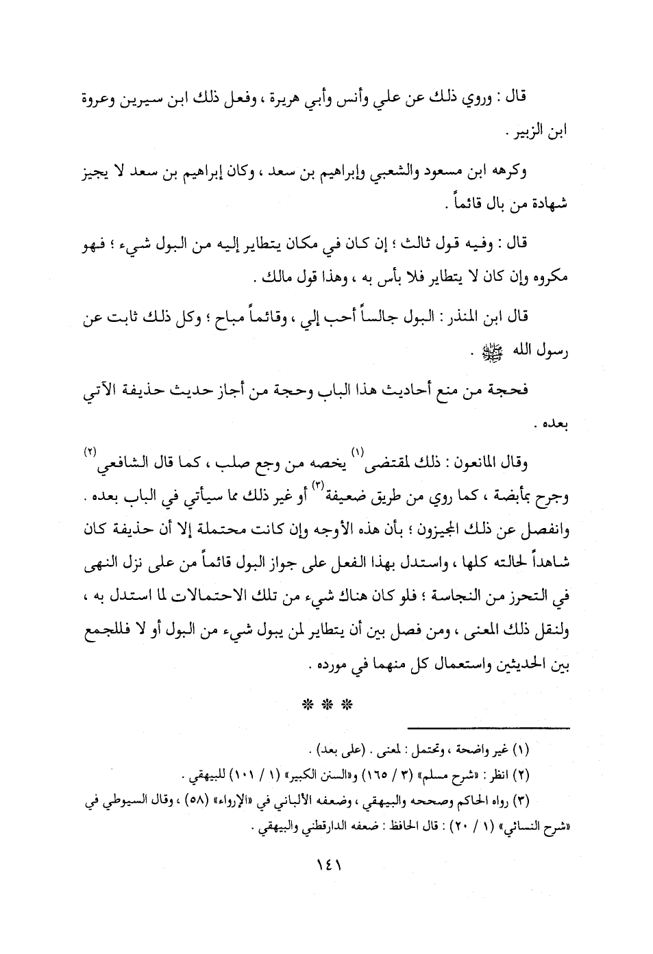 قال ابن المنذر: البول جالسًا أحب إلي، وقائمًا مباح؛ وكل ذلك ثابت عن رسول الله - صلى الله عليه وسلم -.