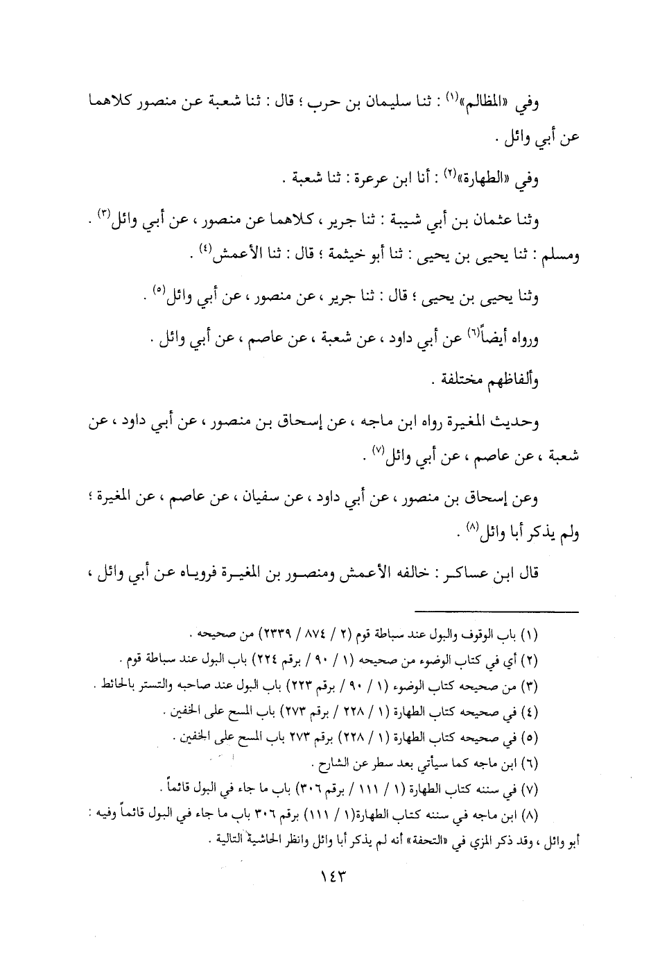 (¬8) ابن ماجه في سننه كتاب الطهارة (1/ 111) برقم 306 باب ما جاء في البول قائمًا وفيه: أبو وائل، وقد ذكر المزي في "التحفة" أنه لم يذكر أبا وائل وانظر الحاشية التالية.