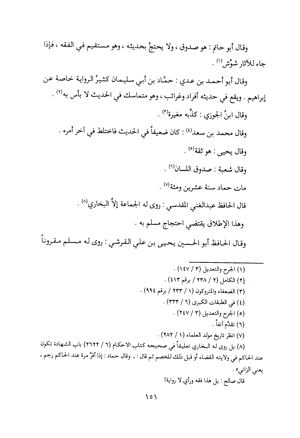(¬8) بل روى له البخاري تعليقًا في صحيحه كتاب الأحكام (6/ 2622) باب الشهادة تكون عند الحاكم في ولايته القضاء أو قبل ذلك للخصم ثم قال: -وقال حماد: إذا أقرَّ مرة عند الحاكم رجم- يعني الزاني".