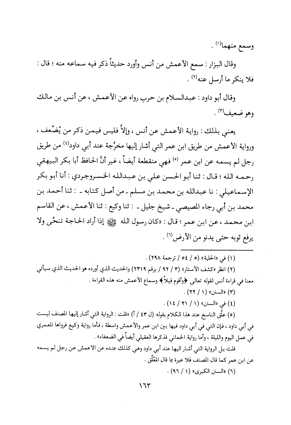 (¬5) علَّق الناسخ عند هذا الكلام بقوله (ل 43 / أ) "قلت: الرواية التي أشار إليها المصنف ليست في أبي داود، فإن التي في أبي داود فيها بين ابن عمر والأعمش واسطة، فأما رواية وكيع فرواها المعمري في عمل اليوم والليلة، وأما رواية الحماني فذكرها العقيلي أيضًا في الضعفاء".