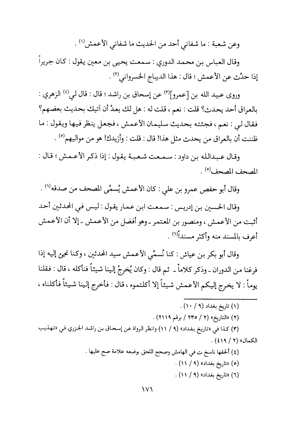 وقال الحسين بن إدريس: سمعت ابن عمار يقول: ليس في المحدثين أحد أثبت من الأعمش، ومنصور بن المعتمر -وهو أفضل من الأعمش- إلا أن الأعمش أعرف بالمسند منه وأكثر مسندًا (6).
