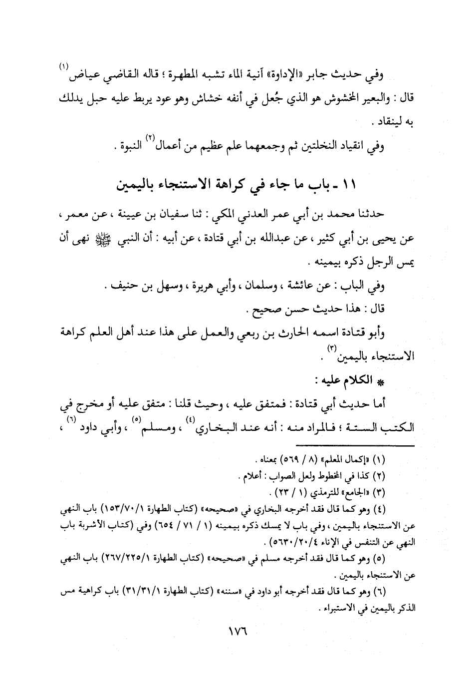 11 - باب ما جاء في كراهة الاستنجاء باليمين
