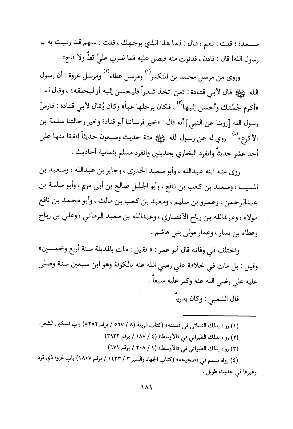 وروى من مرسل محمد بن المنكدر (¬1) ومرسل عطاء (¬2) ومرسل عروة: أن رسول الله - صلى الله عليه وسلم - قال لأبي قتادة: "من اتخذ شعرًا فليحسن إليه أو ليحلقه"، وقال له: "أكرم جُمَّتك وأحسن إليها (¬3). فكان يرجلها غبًّا" وكان يُقال لأبي قتادة: فارسُ رسول الله [روينا عن النبي] أنه قال: "خير فرساننا أبو قتادة وخير رجالتنا سلمة بن الأكوع" (¬4). روي له عن رسول الله - صلى الله عليه وسلم - مئة حديث وسبعون حديثًا اتفقا منها على أحد عشر حديثًا وانفرد البخاري بحديثين وانفرد مسلم بثمانية أحاديث.