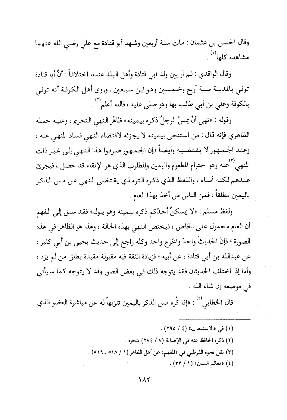 ولفظ مسلم: "لا يمسكنَّ أحدُكم ذكره بيمينه وهو يبول" فقد سبق إلى الفهم أن العام محمول على الخاص، فيختص النهي بهذه الحالة، وهذا هو الظاهر في هذه الصورة؛ فإن الحديثَ واحدٌ والمخرج واحد وكله راجع إلى حديث يحيى بن أبي كثير، عن عبد الله بن أبي قتادة، عن أبيه؛ فزيادة الثقة فيه مقبولة مقيدة بمطلق من لم يزد، وأما إذا اختلف الحديثان فقد يتوجه ذلك في بعض الصور وقد لا يتوجه كما سيأتي في موضعه إن شاء الله.
