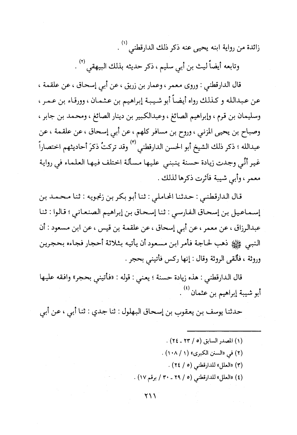 قال الدارقطني: حدثنا المحاملي: ثنا أبو بكر بن زنجويه: ثنا محمد بن إسماعيل بن إسحاق الفارسي: ثنا إسحاق بن إبراهيم الصنعاني؛ قالوا: ثنا عبد الرزاق، عن معمر، عن أبي إسحاق، عن علقمة بن قيس، عن ابن مسعو: أنَّ النبي - صلى الله عليه وسلم - ذهب لحاجة فأمر ابن مسعود أنَّ يأتيه بثلاثة أحجار فجاءه بحجرين وروثة، فألقى الروثة وقال: إنها ركس فأتيني بحجر.