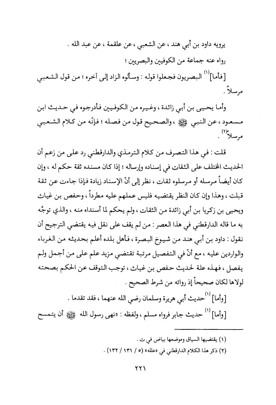 قلت: في هذا التصرف من كلام الترمذي والدارقطني رد على من زعم أنَّ الحديث المختلف على الثقات في إسناده وإرساله؛ إذا كان مسنده ثقة حكم له، وإن كان أيضًا مرسله أو مرسلوه ثقات، نظر إلى أنَّ الإسناد زيادة فإذا جاءت عن ثقة قبلت، وهذا وإن كان النظر يقتضيه فليس عملهم عليه مطردًا، وحفص بن غياث ويحيى بن زكريا بن أبي زائدة من الثقات، ولم يحكم لما أسنداه منه، والذي توجَّه به ما قاله الدارقطني في هذا العصر: من لم يقف على نقل فيه يقتضي الترجيح أنَّ نقول: داود بن أبي هند من شيوخ البصرة، فأهل بلده أعلم بحديثه من الغرباء والواردين عليه، مع أنَّ في التفصيل مرتبة تقتضي مزيد علم على من أجمل ولم يفصل، فهذه علة لحديث حفص بن غياث، توجب التوقف عن الحكم بصحته لولاها لكان صحيحًا إذ رواته من شرط الصحيح.