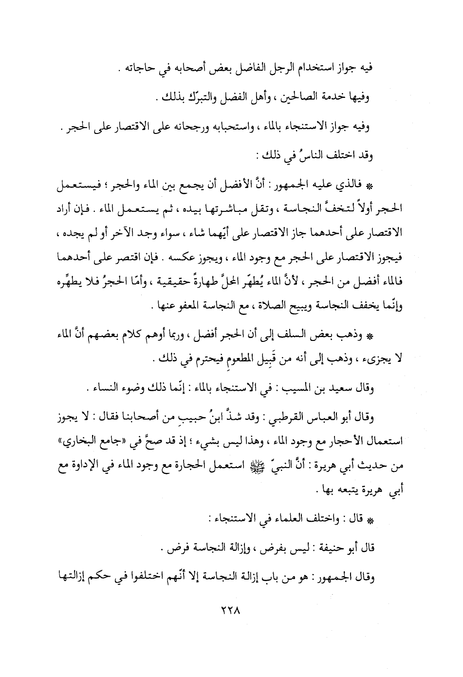 وقال أبو العباس القرطبي: وقد شذَّ ابنُ حبيبِ من أصحابنا فقال: لا يجوز استعمال الأحجار مع وجود الماء، وهذا ليس بشيء، إذ قد صحَّ في "جامع البخاري" من حديث أبي هريرة: أنَّ النبيّ - صلى الله عليه وسلم - استعمل الحجارة مع وجود الماء في الإداوة مع أبي هريرة يتبعه بها.