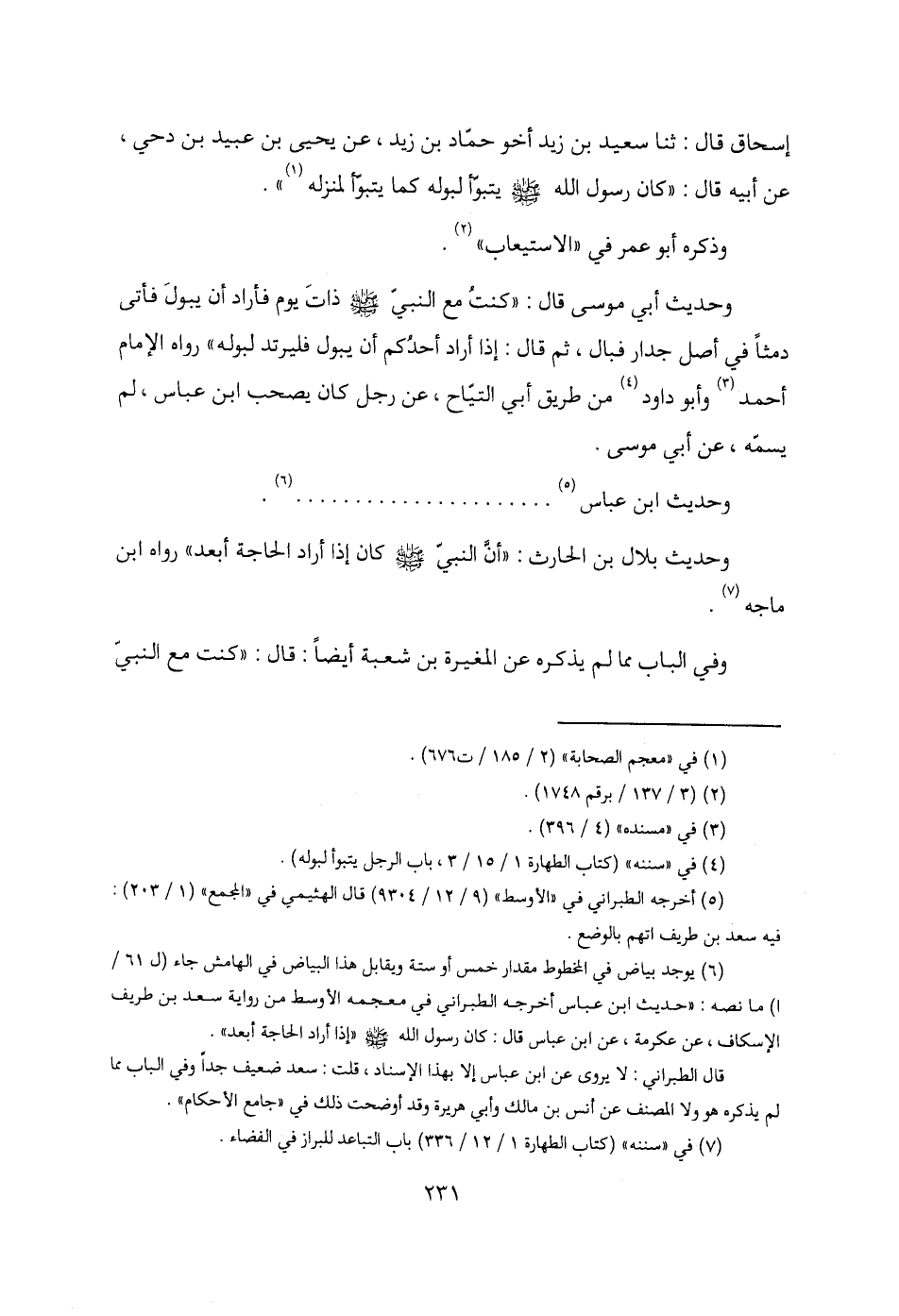 (¬6) يوجد بياض في المخطوط مقدار خمس أو ستة ويقابل هذا البياض في الهامش جاء (ل 61/ ا) ما نصه: "حديث ابن عباس أخرجه الطبراني في معجمه الأوسط من رواية سعد بن طريف الإسكاف، عن عكرمة، عن ابن عباس قال: كان رسول الله - صلى الله عليه وسلم - "إذا أراد الحاجة أبعد".