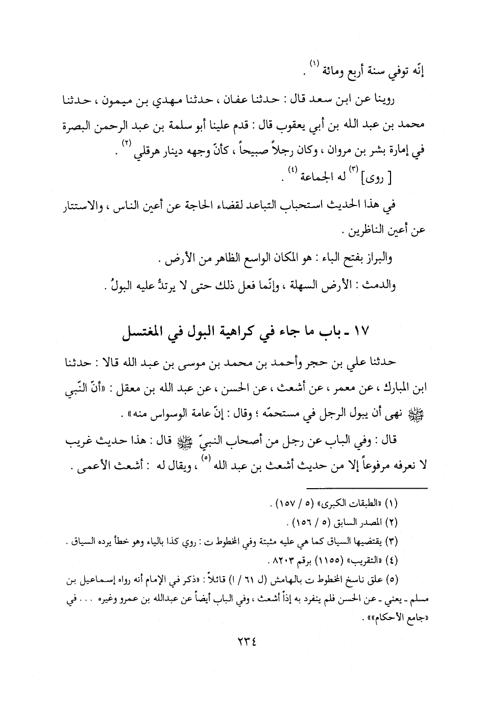 حدثنا علي بن حجر وأحمد بن محمد بن موسى بن عبد الله قالا: حدثنا ابن المبارك، عن معمر، عن أشعث، عن الحسن، عن عبد الله بن معقل: "أنّ النّبي - صلى الله عليه وسلم - نهى أن يبول الرجل في مستحمِّه؛ وقال: إنّ عامة الوسواس منه".