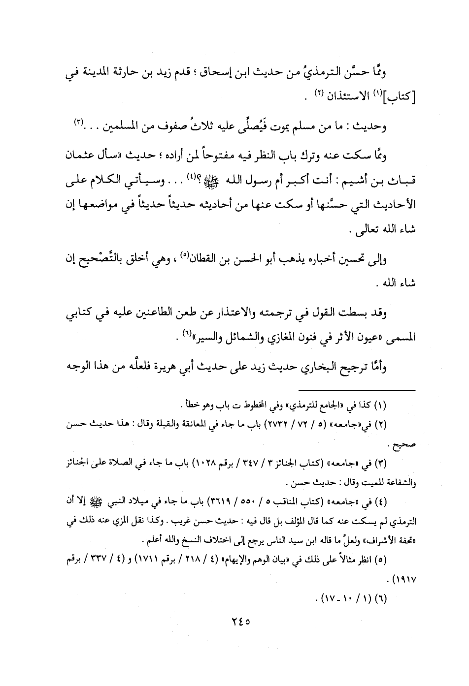وحديث: ما من مسلم يموت فَيُصلِّى عليه ثلاث صفوف من المسلمين ... (¬3) وممَّا سكت عنه وترك باب النظر فيه مفتوحًا لمن أراده؛ حديث "سأل عثمان قباث بن أشيم: أنت أكبر أم رسول الله - صلى الله عليه وسلم -؟ (¬4) ... وسيأتي الكلام على الأحاديث التي حسَّنها أو سكت عنها من أحاديثه حديثًا حديثًا في مواضعها إن شاء الله تعالى.