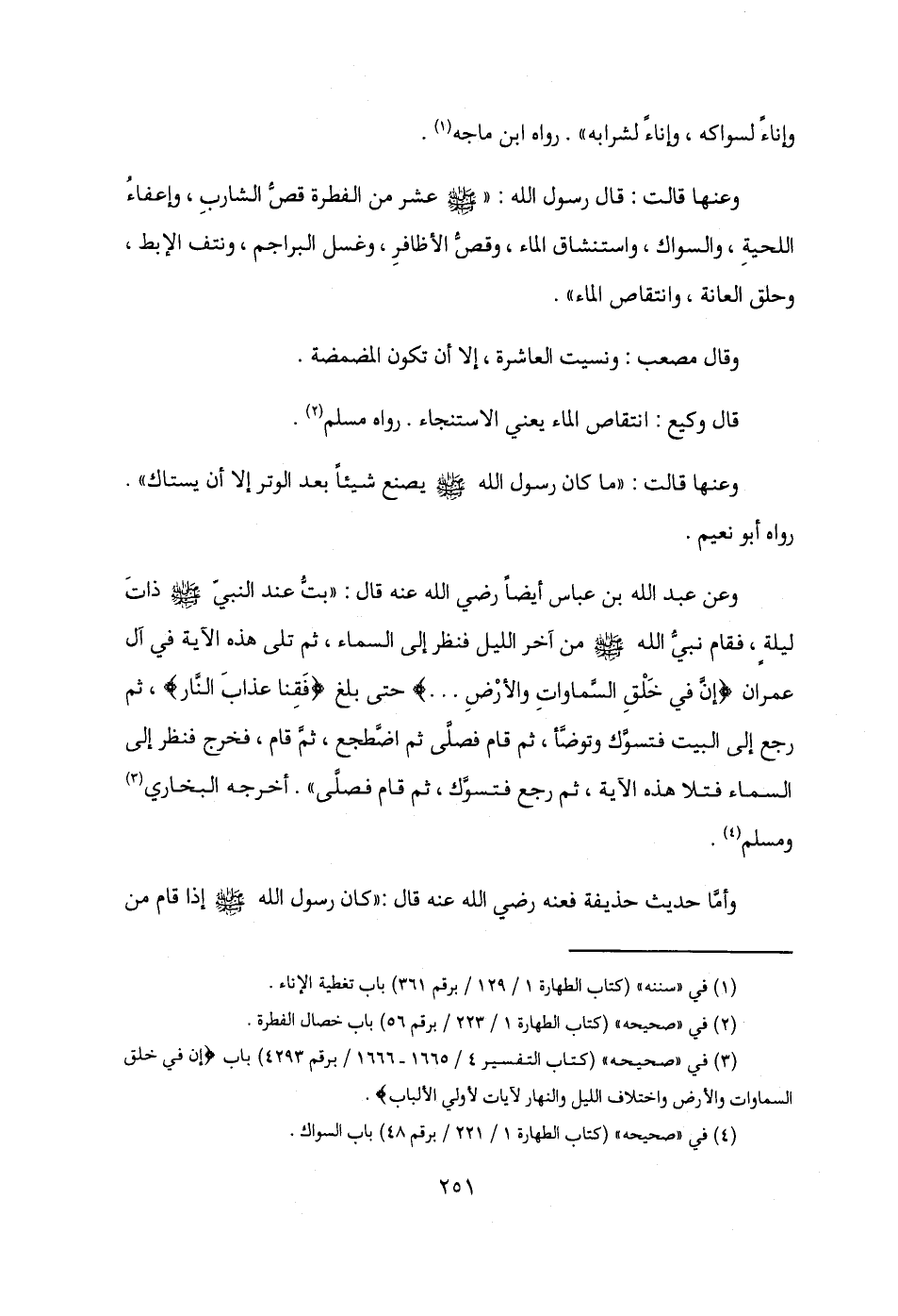 وعنها قالت: قال رسول الله: "- صلى الله عليه وسلم - عشر من الفطرة قصُّ الشاربِ، وإعفاءُ اللحيةِ، والسواك، واستنشاق الماء، وقصُّ الأظافرِ، وغسل البراجم، ونتف الإبط، وحلق العانة، وانتقاص الماء".