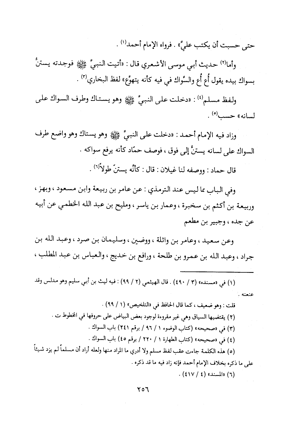 وزاد فيه الإمام أحمد: "دخلت على النبيِّ - صلى الله عليه وسلم - وهو يستاك وهو واضع طرف السواك على لسانه يستنُّ إلى فوق، فوصف حمّاد كأنه يرفع سواكه.