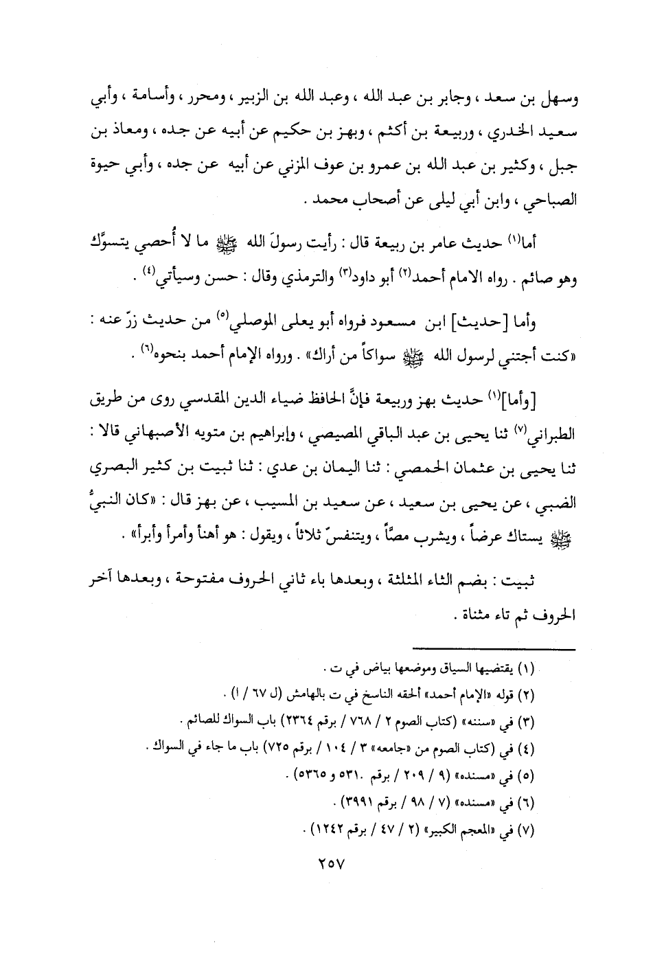 أما (¬1) حديث عامر بن ربيعة قال: رأيت رسولَ الله - صلى الله عليه وسلم - ما لا أحصي يتسوَّك وهو صائم. رواه الإمام أحمد (¬2) أبو داود (¬3) والترمذي وقال: حسن وسيأتي (¬4).