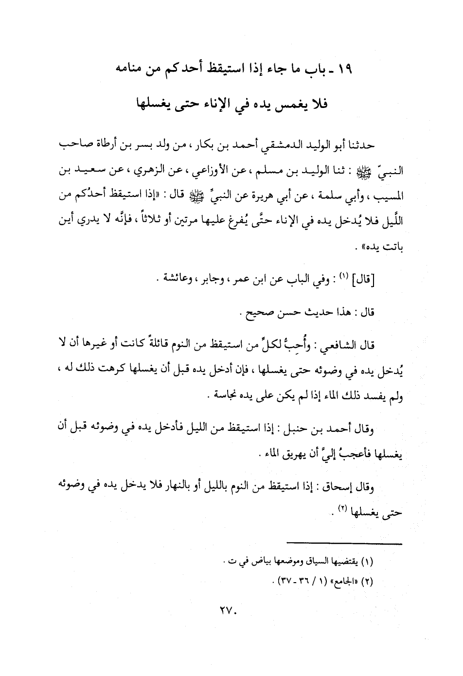 19 - باب ما جاء إذا استيقظ أحدكم من منامه فلا يغمس يده في الإناء حتى يغسلها حدثنا أبو الوليد الدمشقي أحمد بن بكار، من ولد بسر بن أرطاة صاحب النبيّ - صلى الله عليه وسلم -: ثنا الوليد بن مسلم، عن الأوزاعي، عن الزهري، عن سعيد بن المسيب، وأبي سلمة، عن أبي هريرة عن النبيِّ - صلى الله عليه وسلم - قال: "إذا استيقظ أحدُكم من اللَّيل فلا يُدخل يده في الإناء حتَّى يُفرغ عليها مرتين أو ثلاثًا، فإنَّه لا يدري أين باتت يده".