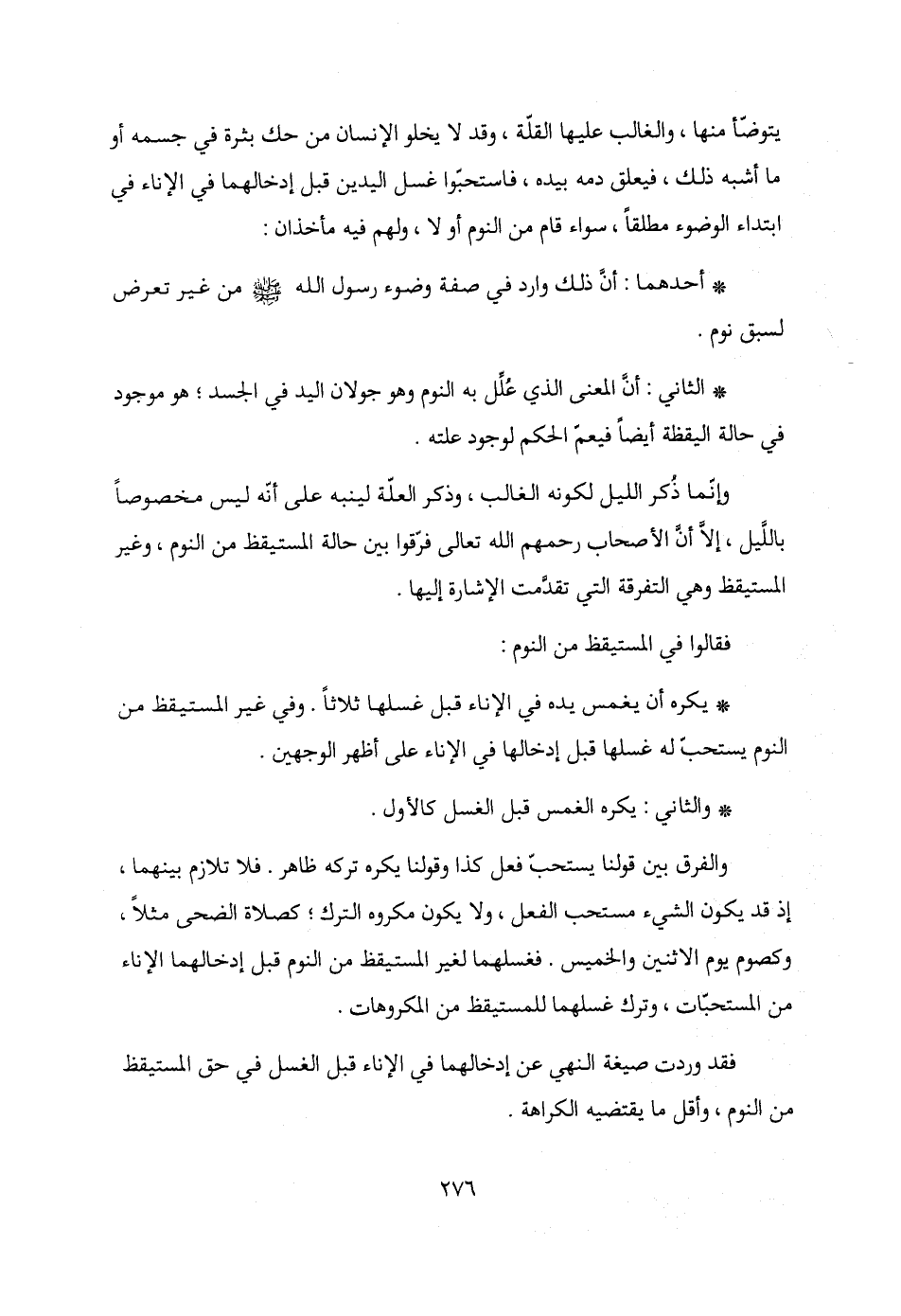 * يكره أن يغمس يده في الإناء قبل غسلها ثلاثًا. وفي غير المستيقظ من النوم يستحبُ له غسلها قبل إدخالها في الإناء على أظهر الوجهين.