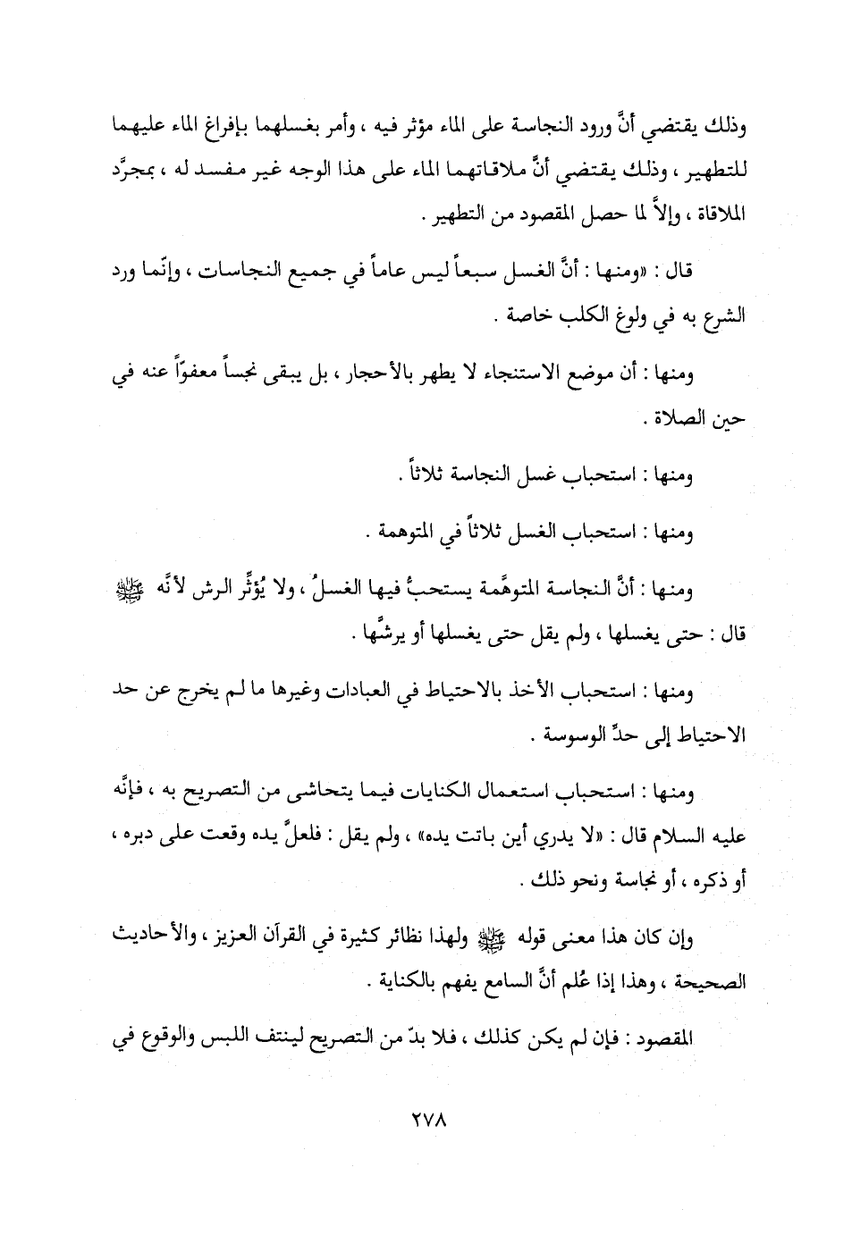 ومنها: أنَّ النجاسة المتوهَّمة يستحبُّ فيها الغسلُ، ولا يُؤثِّر الرش لأنَّه - صلى الله عليه وسلم - قال: حتى يغسلها، ولم يقل حتى يغسلها أو يرشَّها.