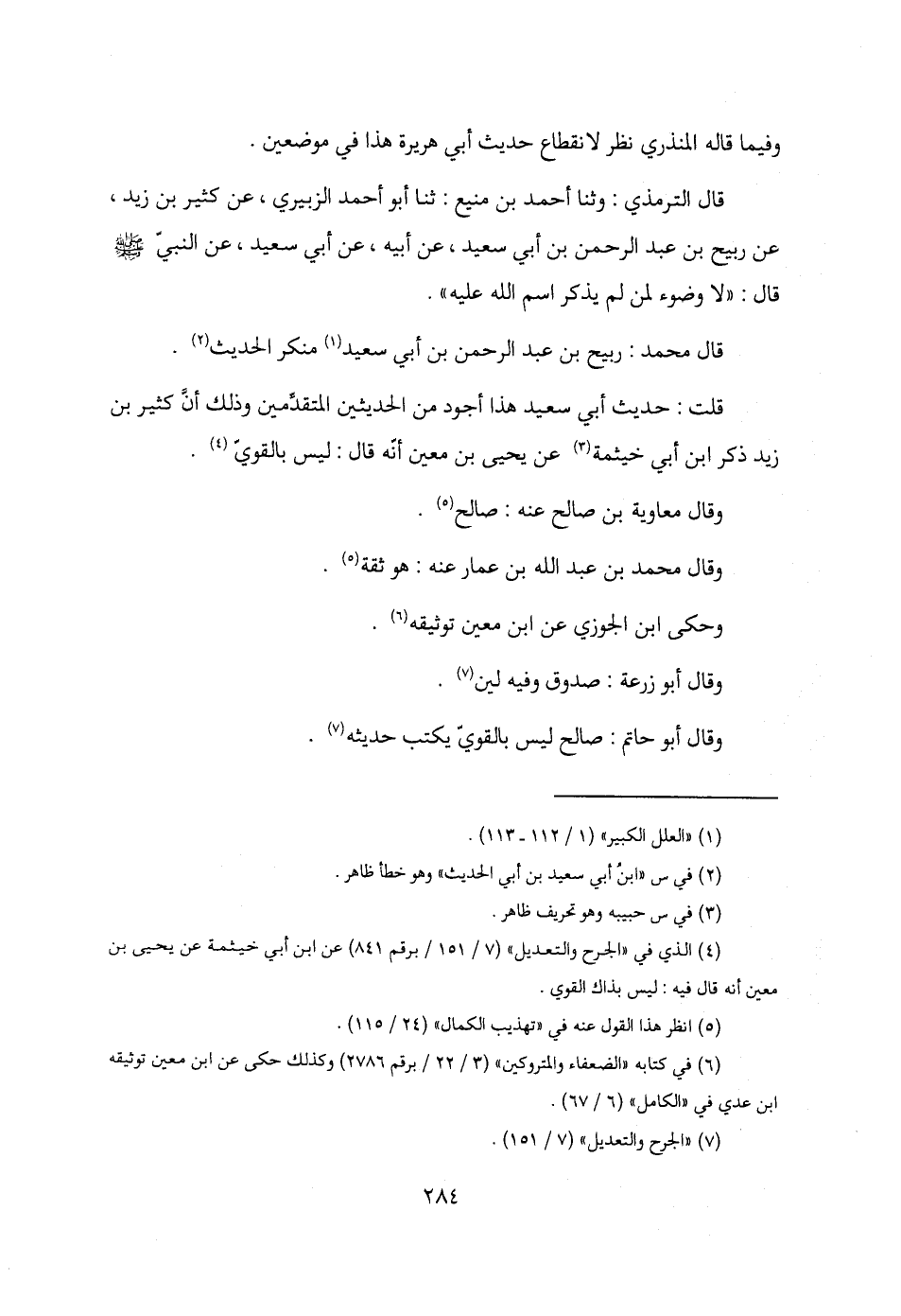 قال الترمذي: وثنا أحمد بن منيع: ثنا أبو أحمد الزبيري، عن كثير بن زيد، عن ربيح بن عبد الرحمن بن أبي سعيد، عن أبيه، عن أبي سعيد، عن النبيّ - صلى الله عليه وسلم - قال: "لا وضوء لمن لم يذكر اسم الله عليه".
