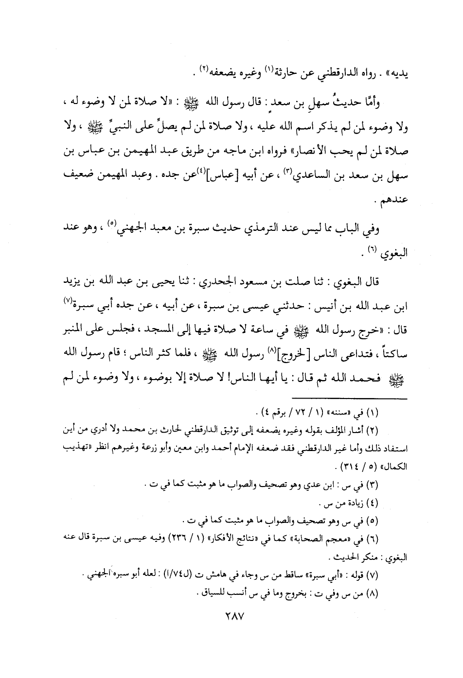 وأمَّا حديثُ سهلِ بن سعدٍ: قال رسول الله - صلى الله عليه وسلم -: "لا صلاة لمن لا وضوء له، ولا وضوء لمن لم يذكر اسم الله عليه، ولا صلاة لمن لم يصلِّ على النبيِّ - صلى الله عليه وسلم -، ولا صلاة لمن لم يحب الأنصار" فرواه ابن ماجه من طريق عبد المهيمن بن عباس بن سهل بن سعد بن الساعدي (¬3)، عن أبيه [عباس] (¬4) عن جده. وعبد المهيمن ضعيف عندهم.