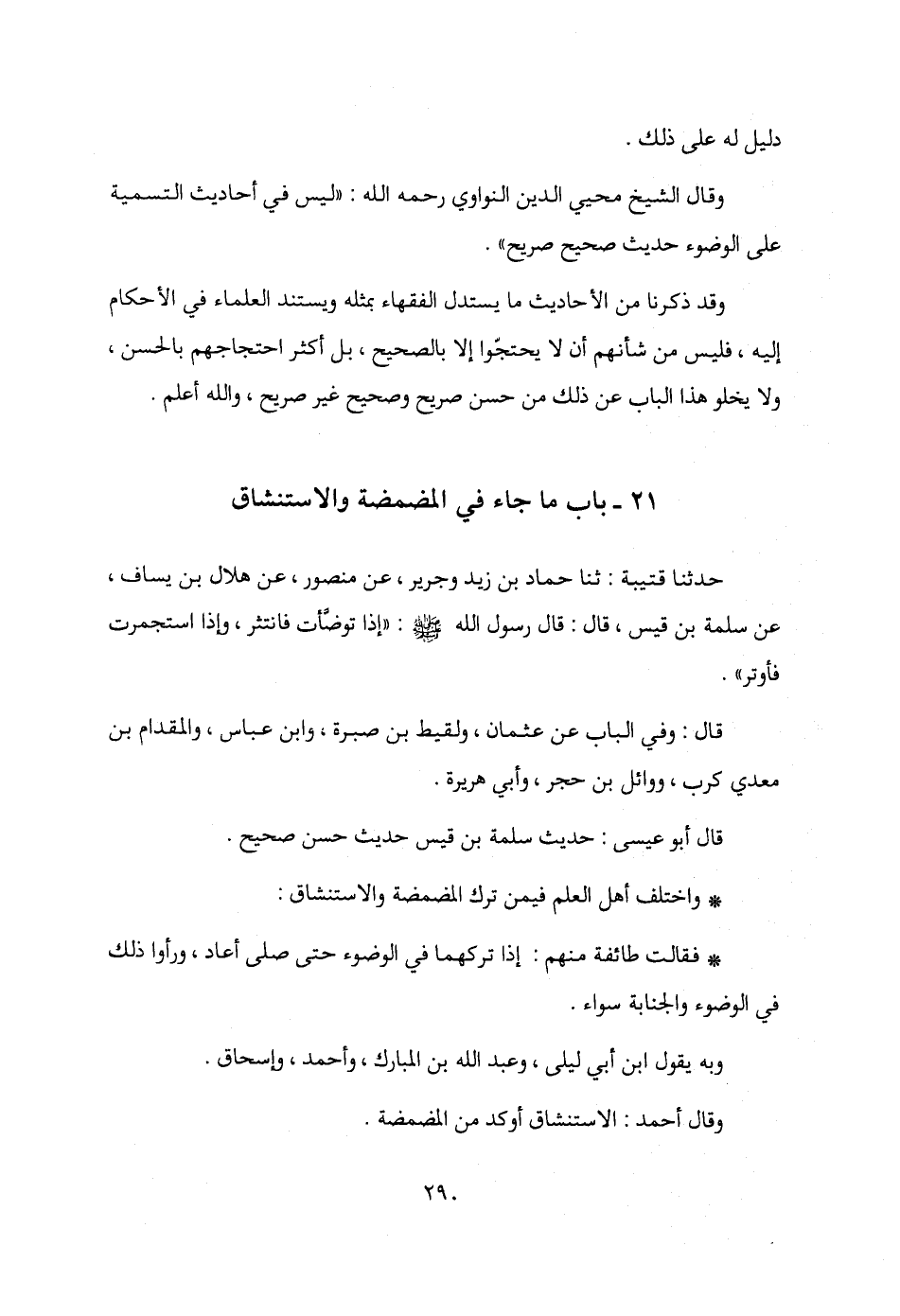 وقال الشيخ محيي الدين النواوي رحمه الله: "ليس في أحاديث التسمية على الوضوء حديث صحيح صريح".