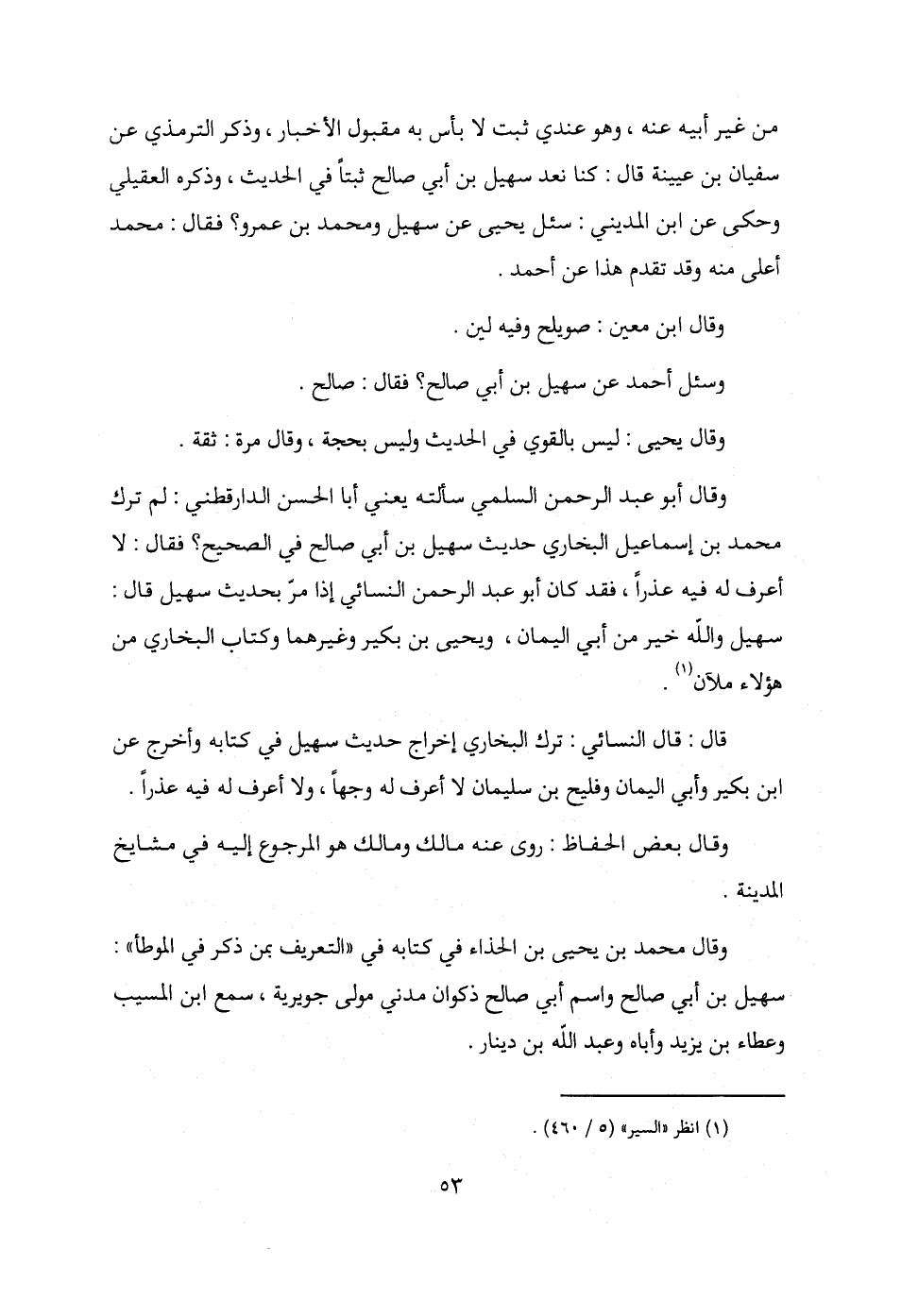 وقال أبو عبد الرحمن السلمي سألته يعني أبا الحسن الدارقطني: لم ترك محمد بن إسماعيل البخاري حديث سهيل بن أبي صالح في الصحيح؟ فقال: لا أعرف له فيه عذرًا، فقد كان أبو عبد الرحمن النسائي إذا مرّ بحديث سهيل قال: سهيل والله خير من أبي اليمان، ويحيى بن بكير وغيرهما وكتاب البخاري من هؤلاء ملآن (¬1).
