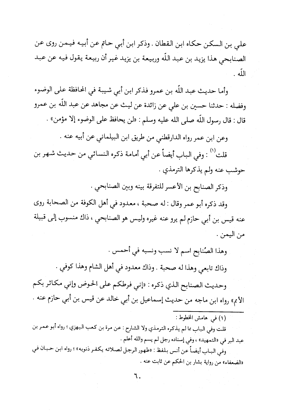 وأما حديث عبد الله بن عمرو فذكر ابن أبي شيبة في المحافظة على الوضوء وفضله: حدثنا حسين بن علي عن زائدة عن ليث عن مجاهد عن عبد الله بن عمرو قال: قال رسول الله صلى الله عليه وسلم: "لن يحافظ على الوضوء إلا مؤمن".