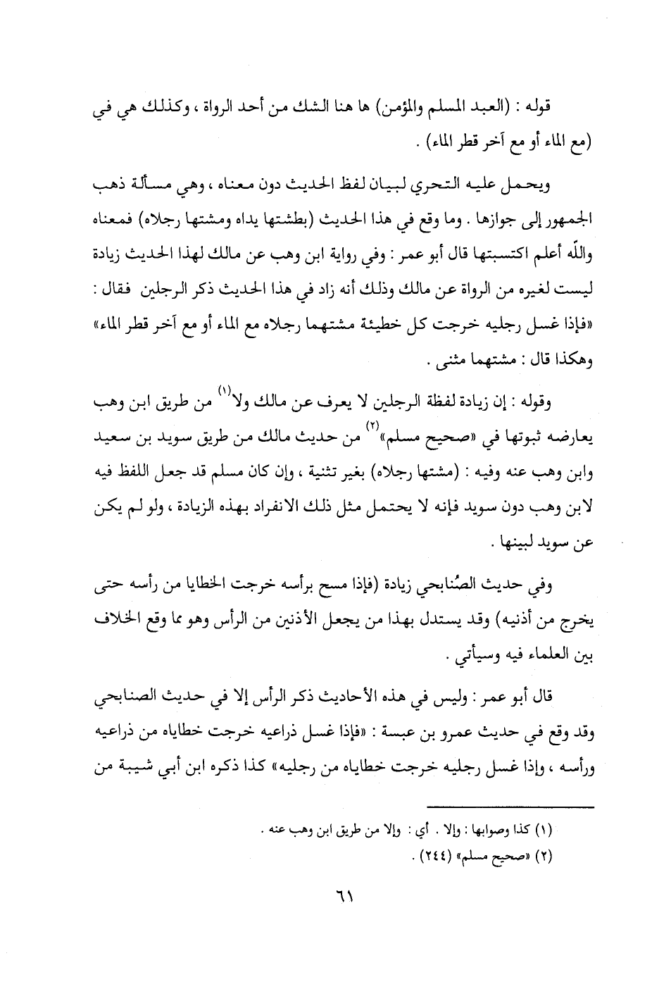 ويحمل عليه التحري لبيان لفظ الحديث دون معناه، وهي مسألة ذهب الجمهور إلى جوازها. وما وقع في هذا الحديث (بطشتها يداه ومشتها رجلاه) فمعناه والله أعلم اكتسبتها قال أبو عمر: وفي رواية ابن وهب عن مالك لهذا الحديث زيادة ليست لغيره من الرواة عن مالك وذلك أنه زاد في هذا الحديث ذكر الرجلين فقال: "فإذا غسل رجليه خرجت كل خطيئة مشتهما رجلاه مع الماء أو مع آخر قطر الماء" وهكذا قال: مشتهما مثنى.