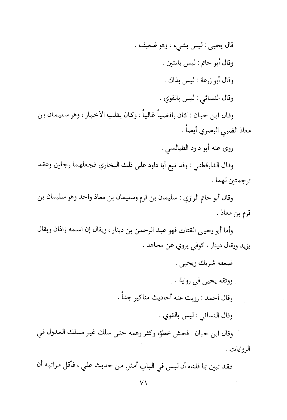 وقال ابن حبان: كان رافضيًّا غاليًا، وكان يقلب الأخبار، وهو سليمان بن معاذ الضبي البصري أيضًا.