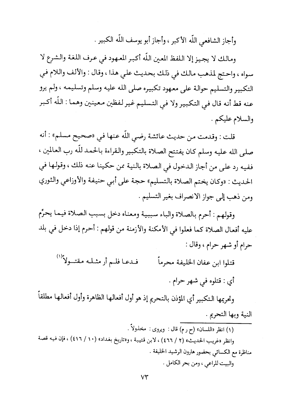 ومالك لا يجيز إلا اللفظ المعين الله أكبر المعهود في عرف اللغة والشرع لا سواه، واحتج لمذهب مالك في ذلك بحديث علي هذا، وقال: والألف واللام في التكبير والتسليم حوالة على معهود تكبيره صلى الله عليه وسلم وتسليمه، ولم يرو عنه قط أنه قال في التكبير ولا في التسليم غير لفظين معينين وهما: الله أكبر والسلام عليكم.