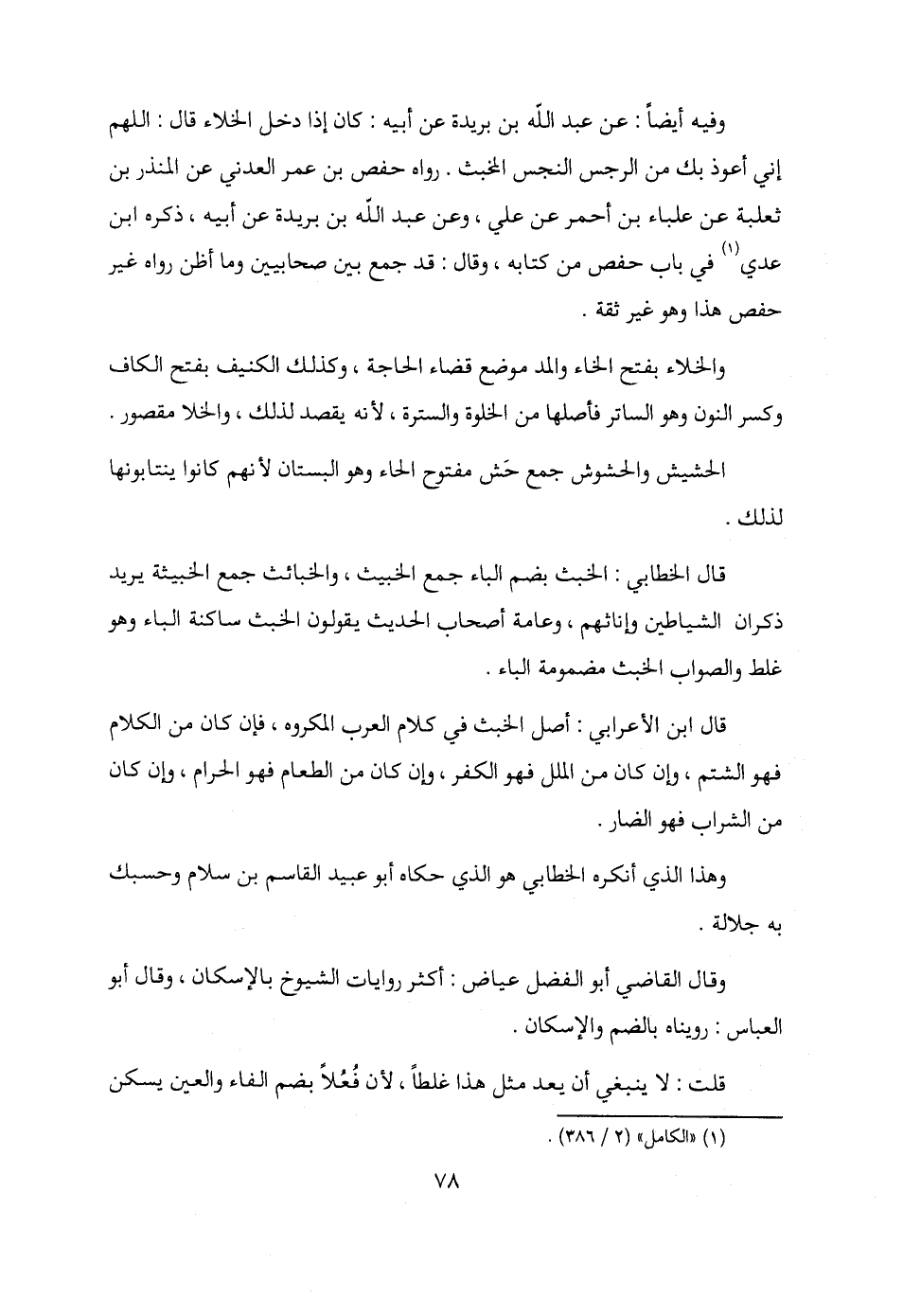 وفيه أيضًا: عن عبد الله بن بريدة عن أبيه: كان إذا دخل الخلاء قال. اللهم إني أعوذ بك من الرجس النجس المخبث. رواه حفص بن عمر العدني عن المنذر بن ثعلبة عن علباء بن أحمر عن علي، وعن عبد الله بن بريدة عن أبيه، ذكره ابن عدي (¬1) في باب حفص من كتابه، وقال: قد جمع بين صحابيين وما أظن رواه غير حفص هذا وهو غير ثقة.