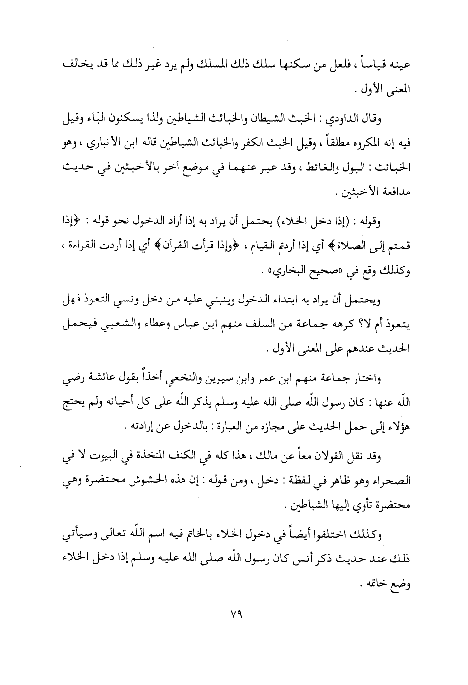 واختار جماعة منهم ابن عمر وابن سيرين والنخعي أخذًا بقول عائشة رضي الله عنها: كان رسول الله صلى الله عليه وسلم يذكر الله على كل أحيانه ولم يحتج هؤلاء إلى حمل الحديث على مجازه من العبارة: بالدخول عن إرادته.