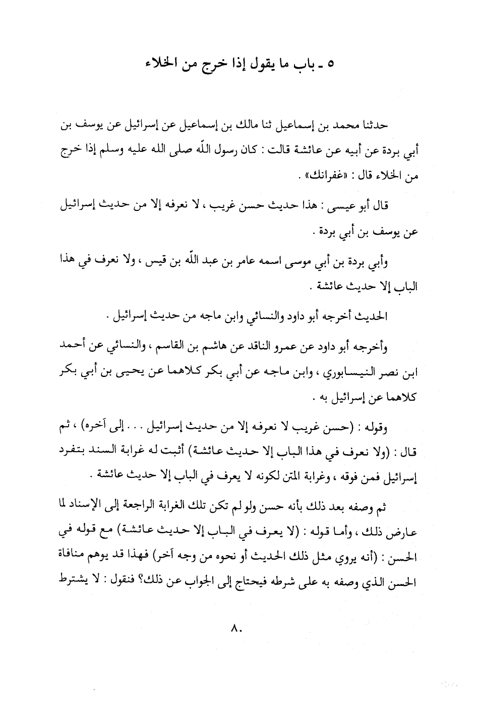حدثنا محمد بن إسماعيل ثنا مالك بن إسماعيل عن إسرائيل عن يوسف بن أبي بردة عن أبيه عن عائشة قالت: كان رسول الله صلى الله عليه وسلم إذا خرج من الخلاء قال: "غفرانك".