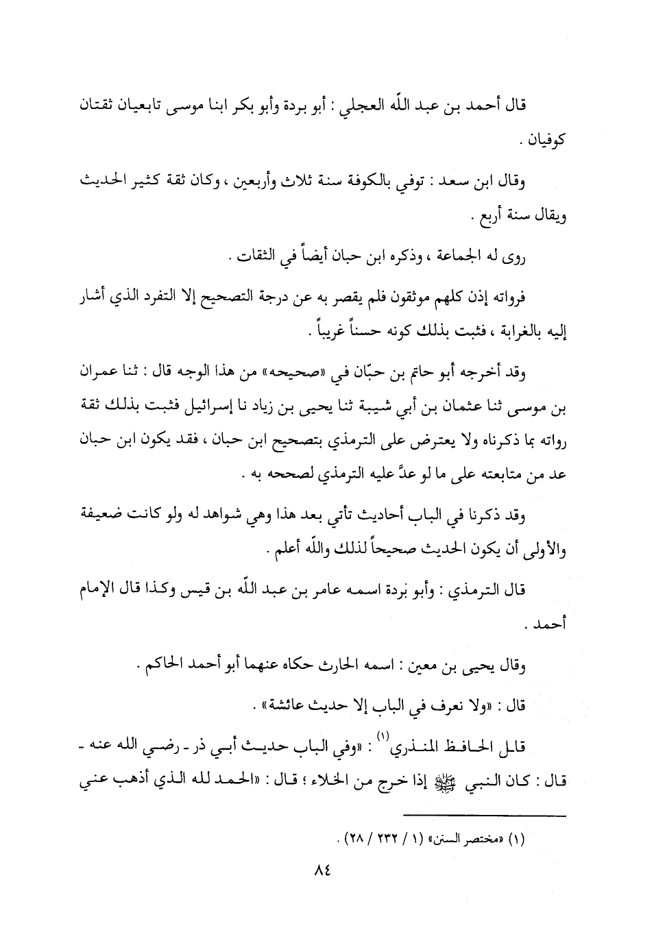 قال الترمذي: وأبو بردة اسمه عامر بن عبد الله بن قيس وكذا قال الإمام أحمد.