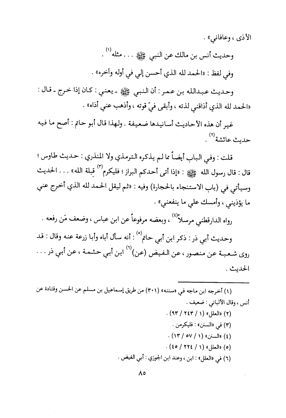 وحديث عبد الله بن عمر: أن النبي - صلى الله عليه وسلم - يعني: كان إذا خرج- قال: "الحمد لله الذي أذاقني لذته، وأبقى فيّ قوته، وأذهب عني أذاه".