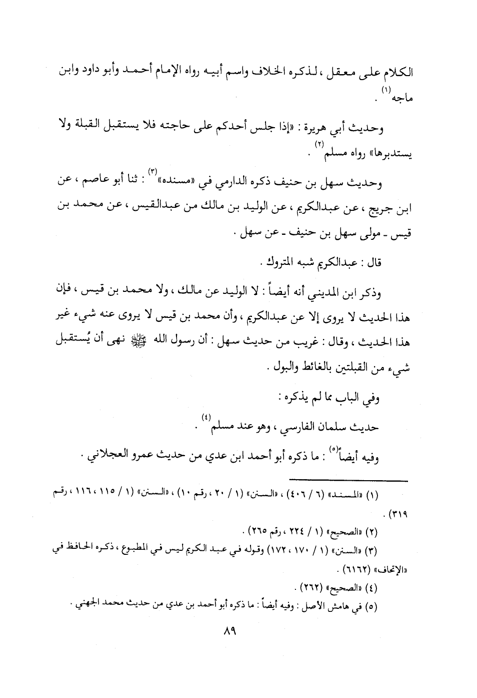 وذكر ابن المديني أنه أيضًا: لا الوليد عن مالك، ولا محمد بن قيس، فإن هذا الحديث لا يروى إلا عن عبد الكريم، وأن محمد بن قيس لا يروى عنه شيء غير هذا الحديث، وقال: غريب من حديث سهل: أن رسول الله - صلى الله عليه وسلم - نهى أن يُستقبل شيء من القبلتين بالغائط والبول.