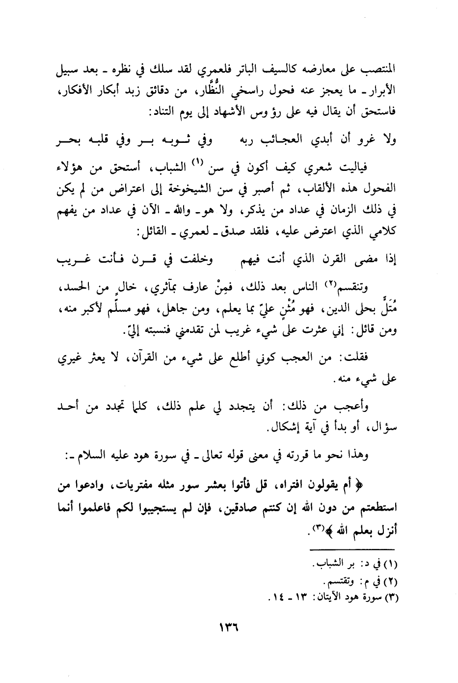 المنتصب على معارضه كالسيف الباتر فلعمري لقد سلك في نظره - بعد سبيل الأبرار - ما يعجز عنه فحول راسخي النظَّار، من دقائق زبد أبكار الأفكار، فاستحق أن يقال فيه على رؤوس الأشهاد إلى يوم التناد: