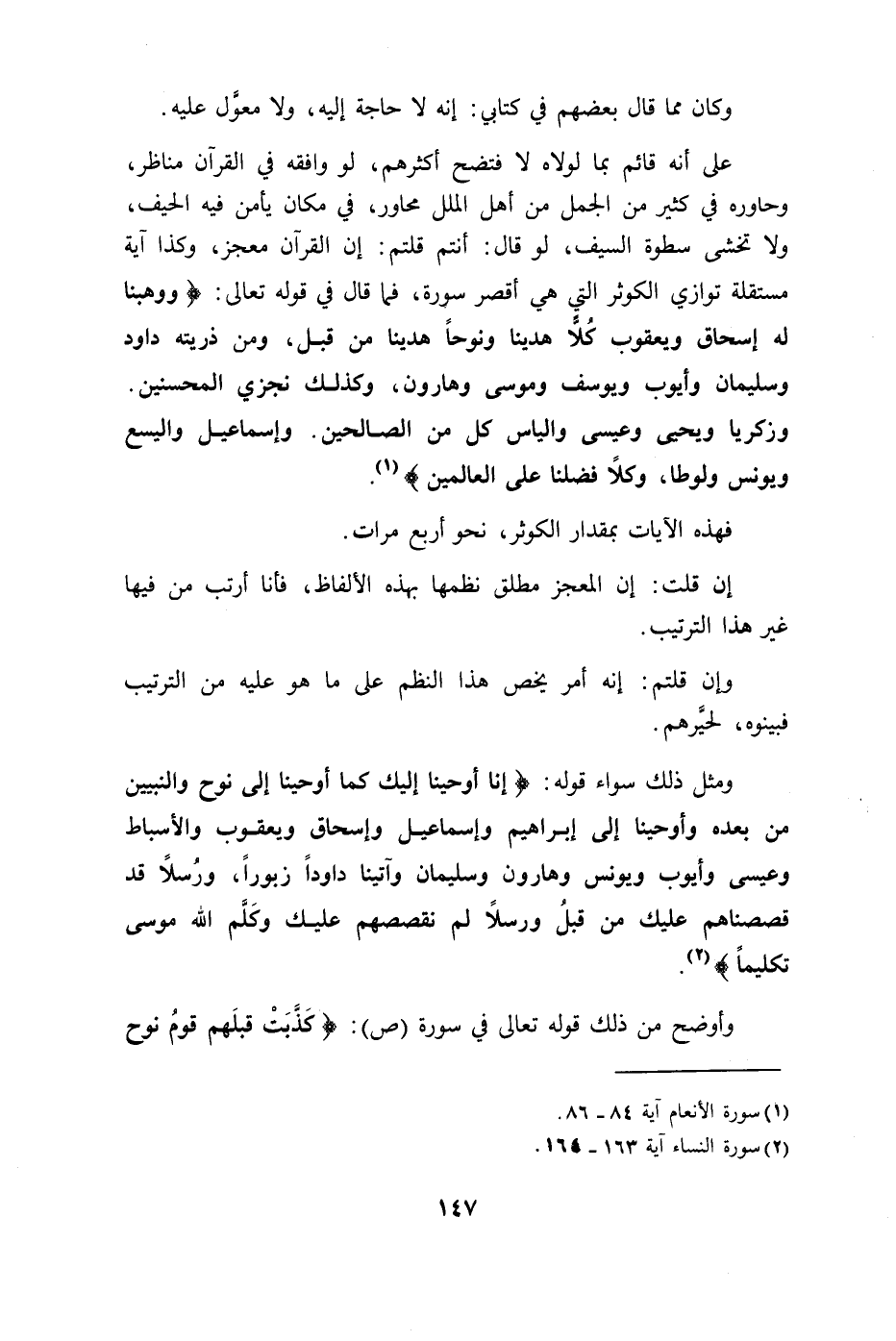 ومثل ذلك سواء قوله: (إِنَّا أَوْحَيْنَا إِلَيْكَ كَمَا أَوْحَيْنَا إِلَى نُوحٍ وَالنَّبِيِّينَ مِنْ بَعْدِهِ وَأَوْحَيْنَا إِلَى إِبْرَاهِيمَ وَإِسْمَاعِيلَ وَإِسْحَاقَ وَيَعْقُوبَ وَالْأَسْبَاطِ وَعِيسَى وَأَيُّوبَ وَيُونُسَ وَهَارُونَ وَسُلَيْمَانَ وَآتَيْنَا دَاوُودَ زَبُورًا (163) وَرُسُلًا قَدْ قَصَصْنَاهُمْ عَلَيْكَ مِنْ قَبْلُ وَرُسُلًا لَمْ نَقْصُصْهُمْ عَلَيْكَ وَكَلَّمَ اللَّهُ مُوسَى تَكْلِيمًا (164)) .