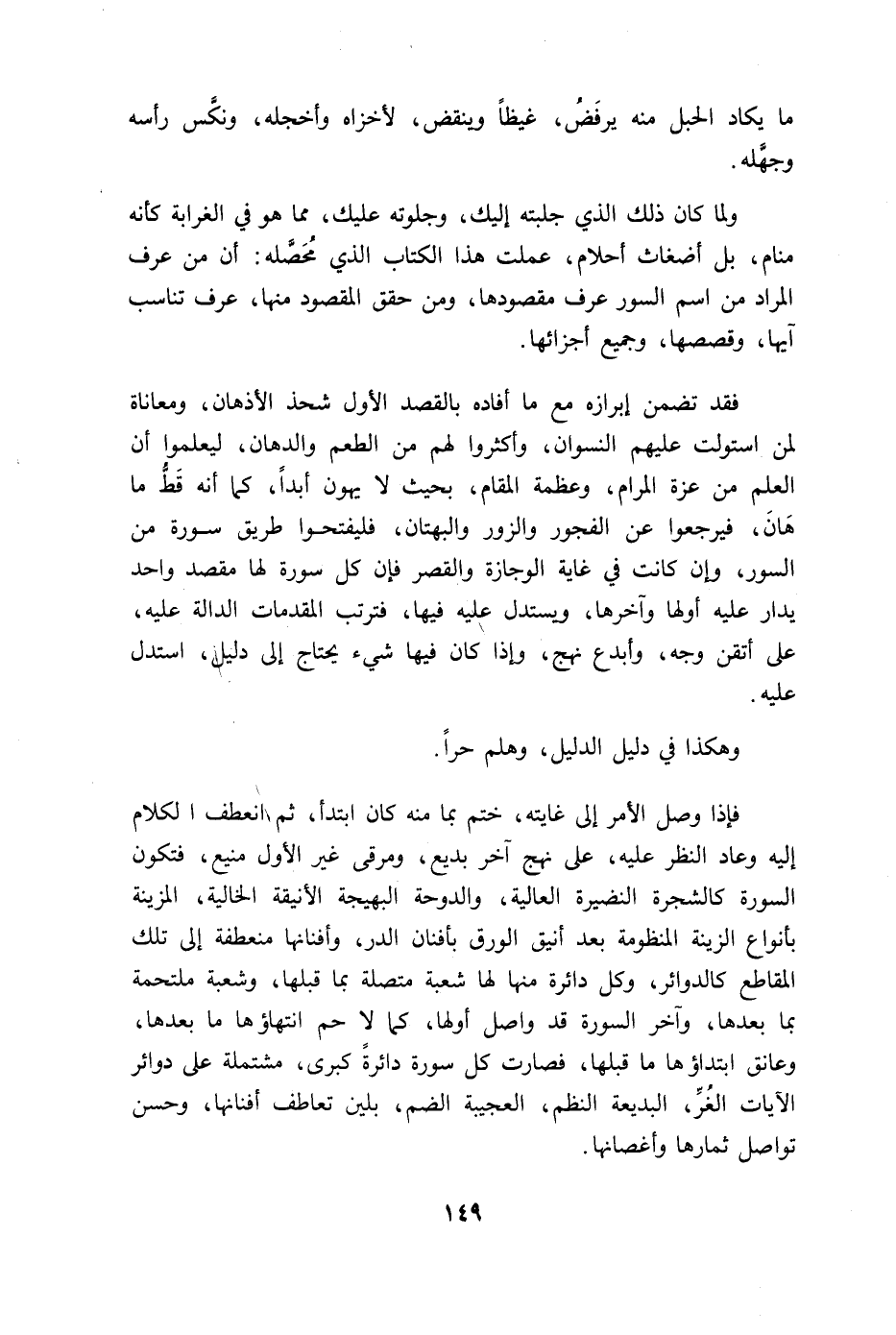 وعانق ابتداؤها ما قبلها، فصارت كل سورة دائرةً كبرى، مشتملة على دوائر الآيات الغُرِّ، البديعة النظم، العجيبة الضم، بلين تعاطف أفنانها، وحسن تواصل ثمارها وأغصانها.