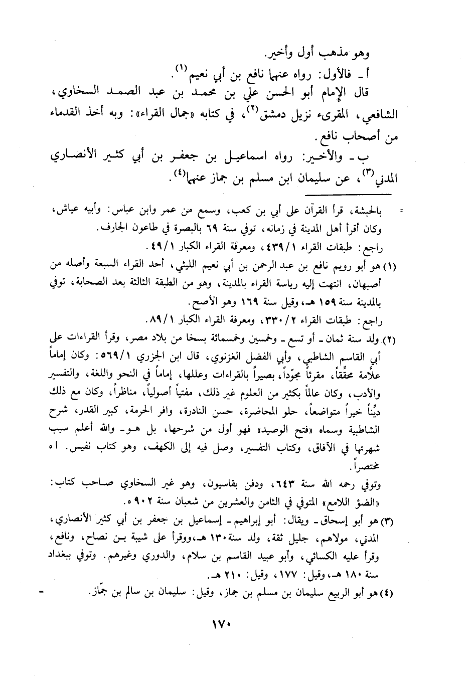 الشافعي، المقرىء نزيل دمشق، في كتابه "جمال القراء": وبه أخذ القدماء