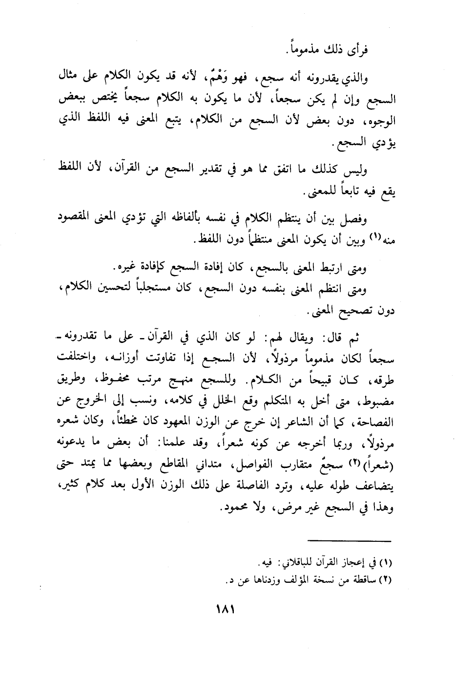 سجعاً لكان مذموماً مرذولاً، لأن السجع إذا تفاوتت أوزانه، واختلفت