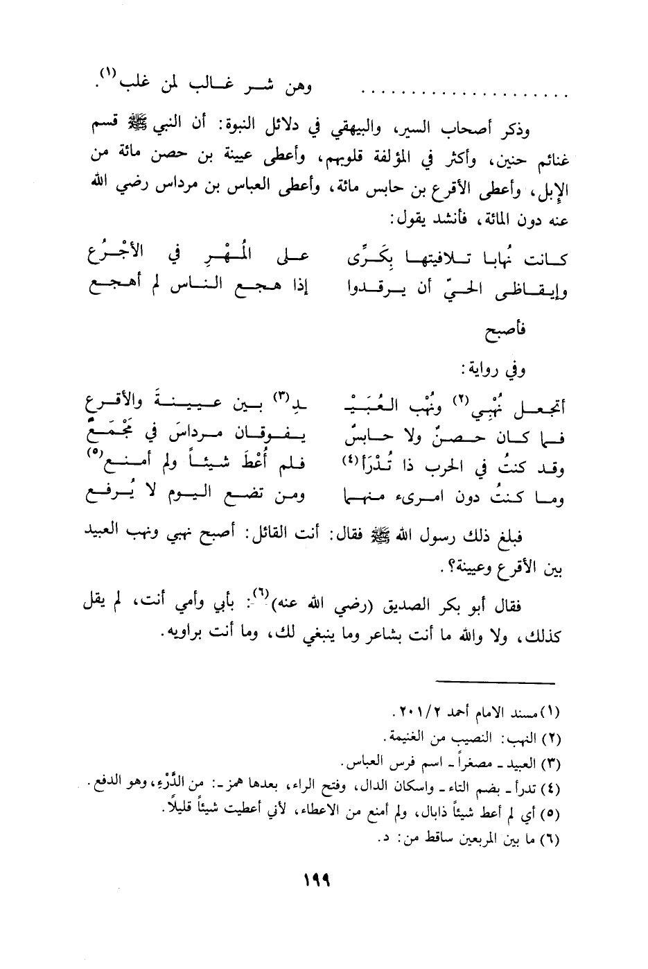 وذكر أصحاب السير، والبيهقي في دلائل النبوة: أن النبي - صلى الله عليه وسلم - قسم غنائم حنين، وأكثر في المؤلفة قلوبهم، وأعطى عيينة بن حصن مائة من الإِبل، وأعطى الأقرع بن حابس مائة، وأعطى العباس بن مرداس رضي الله عنه دون المائة، فأنشد يقول:
