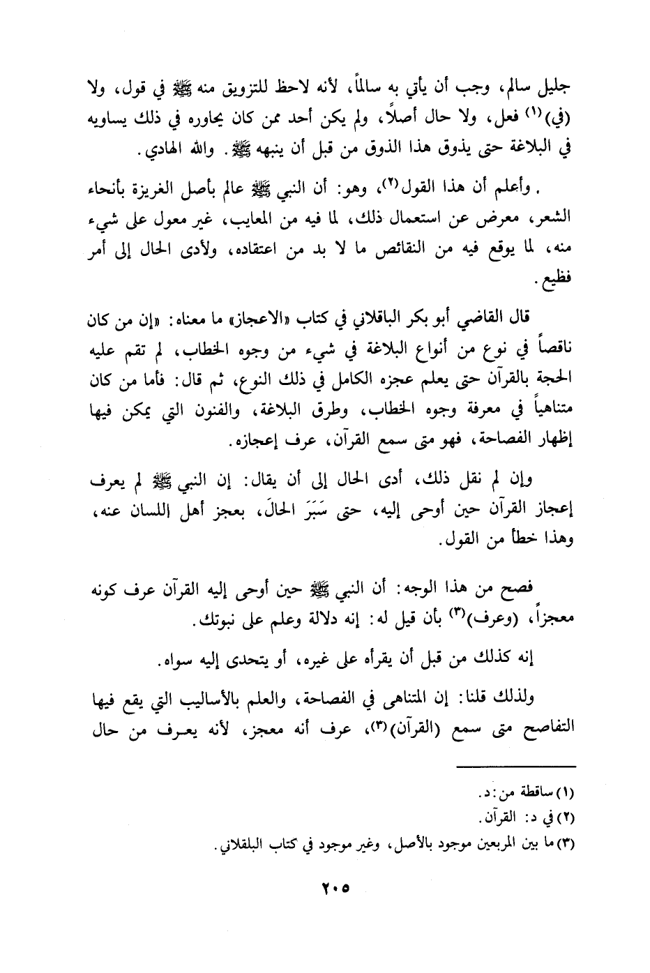 وإن لم نقل ذلك، أدى الحال إلى أن يقال: إن النبي - صلى الله عليه وسلم - لم يعرف إعجاز القرآن حين أوحى إليه، حتى سَبَرَ الحالَ، بعجز أهل اللسان عنه، وهذا خطأ من القول.