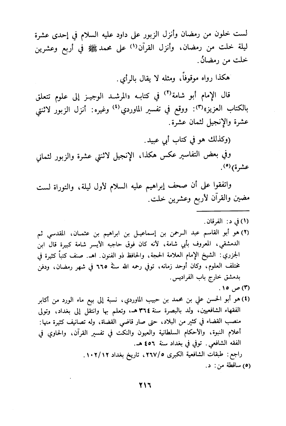 لست خلون من رمضان وأنزل الزبور على داود عليه السلام في إحدى عشرة ليلة خلت من رمضان، وأنزل القرآن على محمد - صلى الله عليه وسلم - في أربع وعشرين خلت من رمضان.