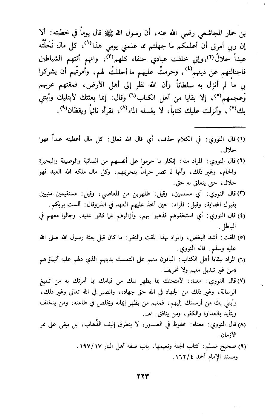 بن حمار المجاشعي رضي الله عنه، أن رسول الله - صلى الله عليه وسلم - قال يوماً في خطبته: ألا إن ربي أمرني أن أعلمكم ما جهلتم مما علمني يومي هذا، كل مال نَحَلْتُه عبداً حلالٌ، وإني خلقت عبادي حنفاء كلهم، وإنهم أتتهم الشياطين فاجتالتهم عن دينهم، وحرمتْ عليهم ما أحللتُ لهم، وأمرتْهم أن يشركوا بي ما لم أنزل به سلطاناً وأن الله نظر إلى أهل الأرض، فمقتهم عربهم وعجمهم، إلا بقايا من أهل الكتاب وقال: إنما بعثتك لأبتليك وأبتلي بك، وأنزلت عليك كتابا، لا يغسله الماء، تقرأه نائما ويقظان.