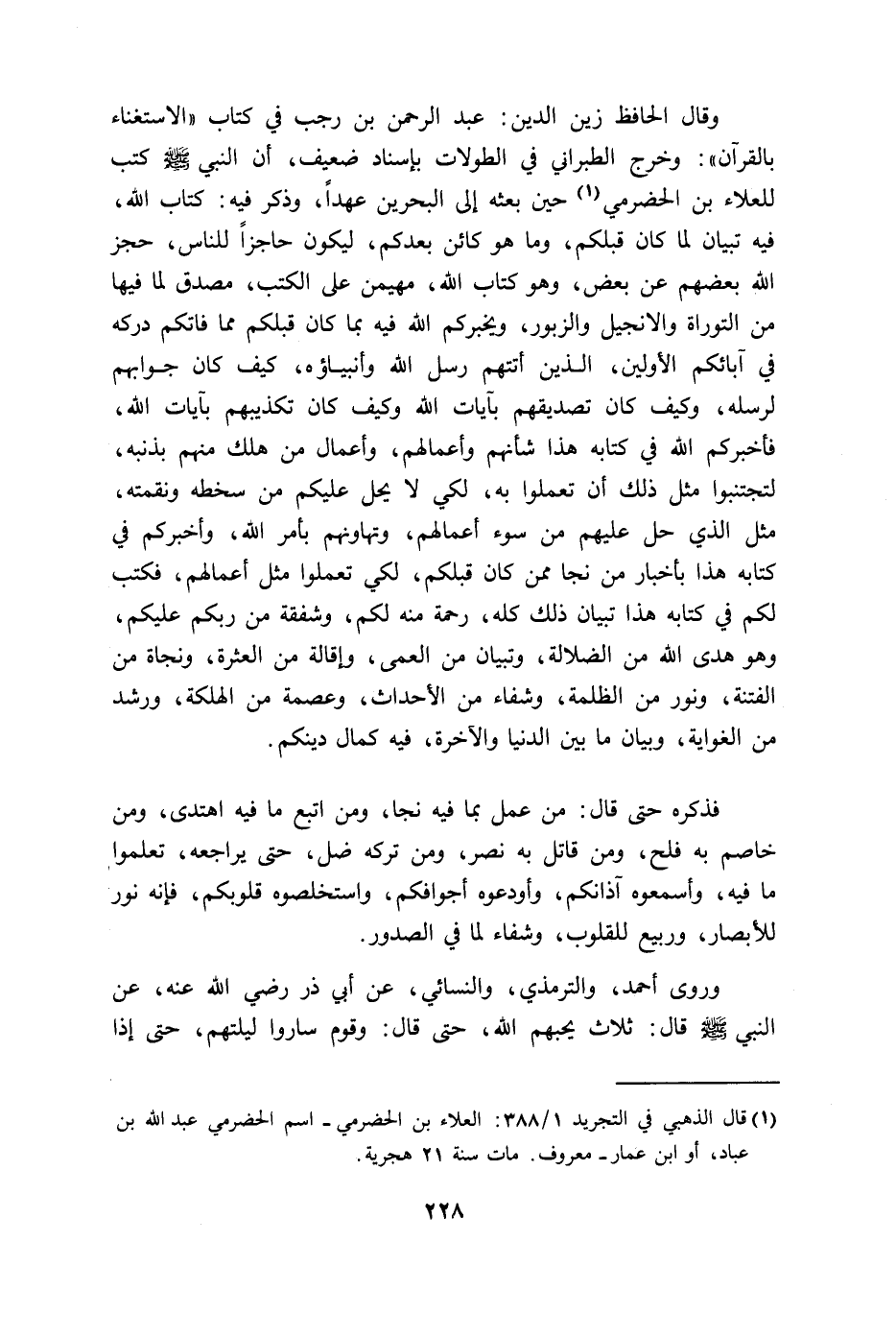 بالقرآن ": وخرج الطبراني في الطولات بإسناد ضعيف، أن النبي - صلى الله عليه وسلم - كتب للعلاء بن الحضرمي حين بعثه إلى البحرين عهداً، وذكر فيه: كتاب الله، فيه تبيان لما كان قبلكم، وما هو كائن بعدكم، ليكون حاجزاً للناس، حجز الله بعضهم عن بعض، وهو كتاب الله، مهيمن على الكتب، مصدق لما فيها من التوراة والإنجيل والزبور، ويخبركم الله فيه بما كان قبلكم مما فاتكم دركه في آبائكم الأولين، الذين أتتهم رسل الله وأنبياؤه، كيف كان جوابهم لرسله، وكيف كان تصديقهم بآيات الله وكيف كان تكذيبهم بآيات الله، فأخبركم الله في كتابه هذا شأنهم وأعمالهم، وأعمال من هلك منهم بذنبه، لتجتنبوا مثل ذلك أن تعملوا به، لكي لا يحل عليكم من سخطه ونقمته، مثل الذي حل عليهم من سوء أعمالهم، وتهاونهم بأمر الله، وأخبركم في كتابه هذا بأخبار من نجا ممن كان قبلكم، لكي تعملوا مثل أعمالهم، فكتب لكم في كتابه هذا تبيان ذلك كله، رحمة منه لكم، وشفقة من ربكم عليكم، وهو هدى الله من الضلالة، وتبيان من العمى، وإقالة من العثرة، ونجاة من الفتنة، ونور من الظلمة، وشفاء من الأحداث، وعصمة من الهلكة، ورشد من الغواية، وبيان ما بين الدنيا والأخرة، فيه كمال دينكم.