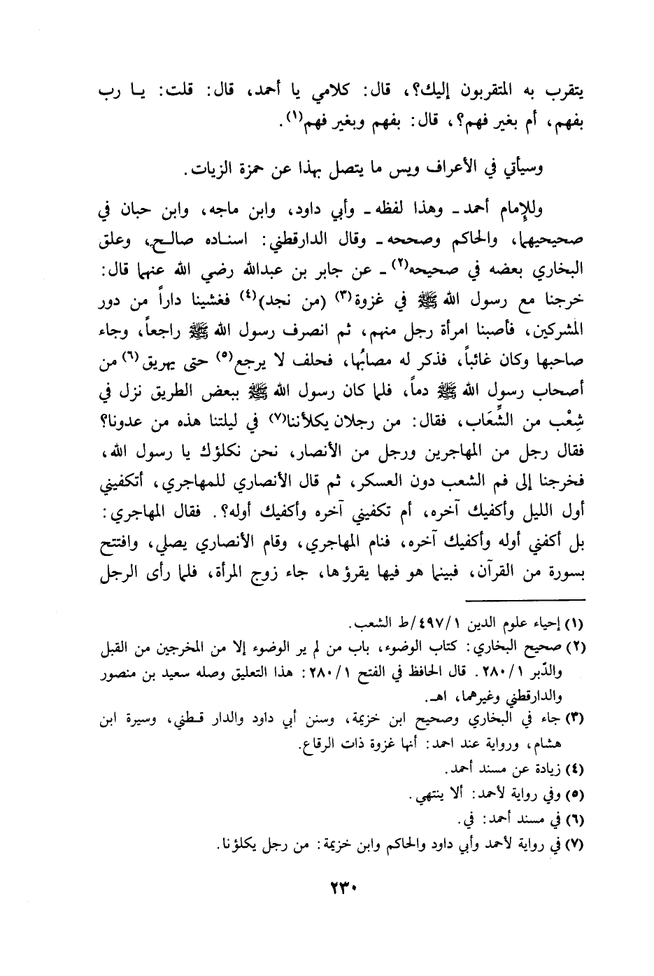 خرجنا مع رسول الله - صلى الله عليه وسلم - في غزوة (من نجد) فغشينا داراً من دور المشركين، فأصبنا امرأة رجل منهم، ثم انصرف رسول الله - صلى الله عليه وسلم - راجعاً، وجاء صاحبها وكان غائباً، فذكر له مصابُها، فحلف لا يرت حتى يهريق من