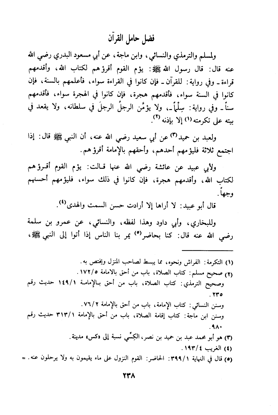 عنه قال: قال رسول الله - صلى الله عليه وسلم -: يؤم القوم أقرؤهم لكتاب الله، وأقدمهم قراءة - وفي رواية: للقرآن - فإن كانوا في القراءة سواء، فأعلمهم بالسنة، فإن كانوا في السنة سواء، فأقدمهم هجرة، فإن كانوا في الهجرة سواء، فأقدمهم سناً - وفي رواية: سِلْما -، ولا يؤمَّن الرجل الرجلَ في سلطانه، ولا يقعد في بيته على تكرمته إلا بإذنه.
